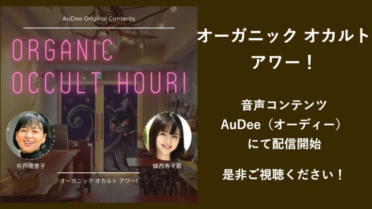 ※AuDeeのサービスは終了いたしました。現在はPod Cast他で絶賛配信中です。「オーガニック オカルト アワー!」で検索ください。2025.12.31. 2021年にTOKYO FMおよびJFNC系列によるAuDeeにて、タレントの鎮西寿々歌(ちんぜいすずか)さんと井戸理恵子によるオリジナル音声番組「オーガニック […]